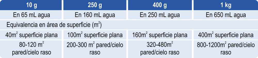 COMO PINTURA: Mezclar y revolver suficientemente 250 g de Muscid® 10 WG en 160 mL de agua tibia, en un recipiente separado hasta obtener una mezcla dispersable. Esta cantidad es suficiente para una construcción con un área de 100 m2, o una superficie plana (pared o cielo raso) de 250 m2. Se aplica un mínimo de 20 pinceladas o parches, cada una de ellas de 10x30 cm por 100 m2 de superficie. Cuando la superficie por pintar es insuficiente, o si el cambio de color es inaceptable, se pintan tiras de cartulina o polietileno y se cuelgan.