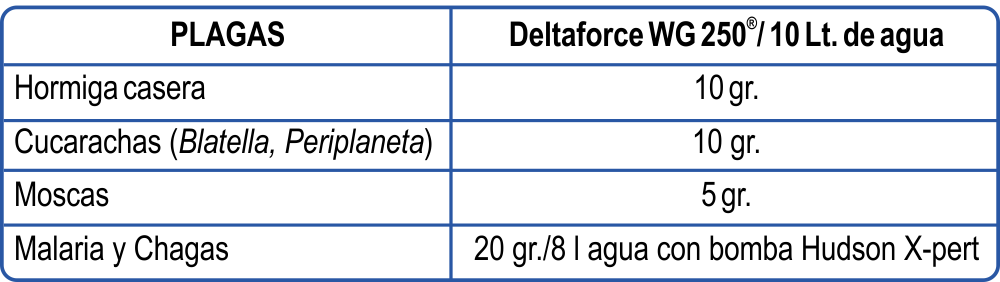 Control de vectores de enfermedades (Malaria y Chagas): Un sobre de 20 g diluido en 8 litros de agua para tratar 200m2, dejando un depósito de I.A. Deltametrina de 25 mg por m2. Se debe utilizar una aspersora de compresión manual tipo Hudson X-Pert.